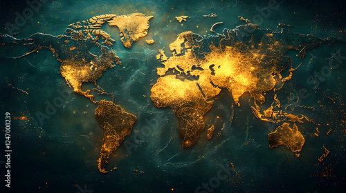 Illuminated World Map: Golden Continents & Oceans on a Dark Background, Abstract Art Design for Geography, Travel, and Exploration with Vibrant Colors and Cosmic Texture