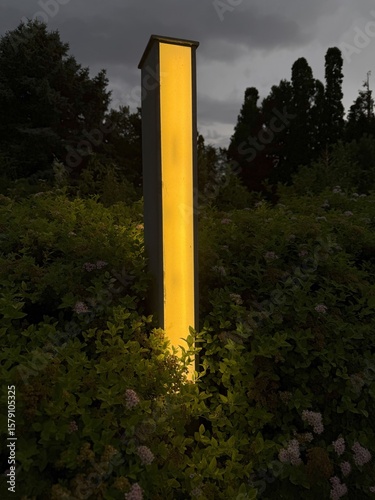 pillar, light, glowing, yellow, illumination, garden, evening, shrub, moody, landscape, design, stormy, sky, silhouette, modern, dusk, nature, ambient, lighting, structure, vertical, serene, atmospheric, architecture, dark, aglow, minimal, twilight, urban, contrast, foliage, dramatic, scene, gloaming, glow, shadow, decorative, scenic, peaceful, natural, mysterious, aesthetic, solitude, tower, blue, historical building, green, building
