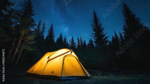 Illuminated Yellow Tent Under Starry Night Sky in Forest Field, Perfect for Stargazing, Camping Adventure, and Wilderness Experience