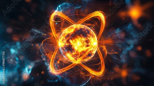 nuclear, fission, atomic, structure, energy, release, scientific, concept, physics, reaction, glowing, atom, power, generation, chain, technically, innovation, research, particle, radiant, nucleus, fusion, process, molecular, transformation, electron, movement, visualisation, discovery, futuristic, technology, beauty