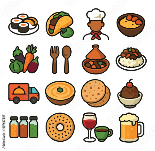illustrated, food, icon, chef, dish, drink, sushi, taco, curry, vegetable, fork, spoon, tagine, couscous, truck, delivery, hummus, pita, dessert, ice cream, condiment, bagel, wine, hot drink, beer, accessing, beverage, meal, cookery, epicure, culinary, dining, delicious, vegetarian, feast, savoury, sweet, international, snack, spice, aroma, presentation, colourful, cartoon, graphic