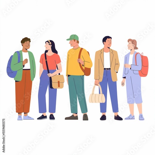 Illustrated Group of Five Young Adults Wearing Casual Outfits and Carrying Bags