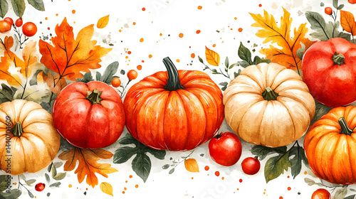 Illustrated vegetable pattern with pumpkins, tomatoes, and seasonal leaves, symbolizing abundance and nourishment