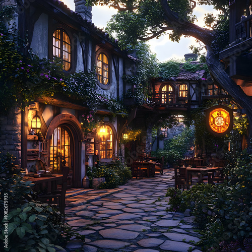 idylli, storybook, whimsical, atmospheric, shadow, plant, enchanted, sunset, greenery, illustration, digital artwork, serene, foliage, rustic, magical, evening, night, peaceful, tree, vine, building, picturesque, mediaeval, fantasy art, dusk, exterior, fairy tale, cosy, architecture, quaint, light, charming, tavern, painting, inviting, flower, community