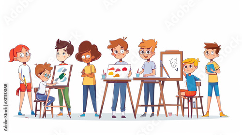 Illustration: A white background with a cartoon depiction of cute students learning art and drawing pictures.