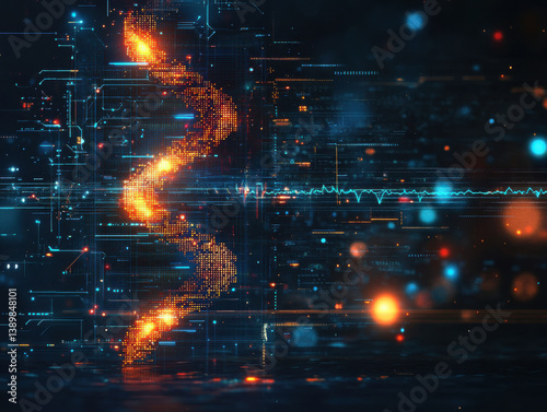 Illustration background of Futuristic DNA helix glowing in digital interface with vibrant technology elements