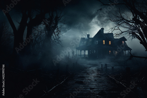 Illustration capturing the ominous atmosphere of a decrepit and haunted mansion, shrouded in darkness and mystery. Ai generated