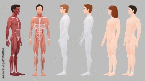human, anatomy, skeleton, illustration, contrast, muscular, detail, showcase, diverse, body, shape, depiction, system, concept, physique, structure, visual, science, health care, study, worked, vector, fitness, beauty, expression, colours, wellness, dimensioning, character, design, figure, female, model, adult, muscle, graphic, cognition, senior, resource, posture