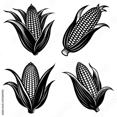 Illustration featuring four ears of corn with husks in a monochrome vector design, food and agriculture theme