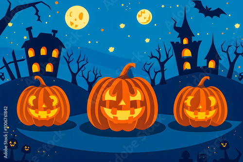 Illustration featuring Jack o' Lantern and castle silhouette at night, perfect for Halloween greetings or special Halloween sales promotions