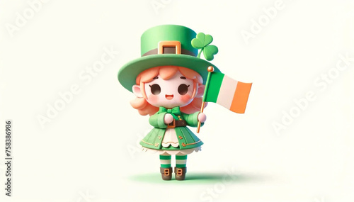 Illustration in Kawaii style, a little girl Leprechaun with the flag of Ireland in her hands