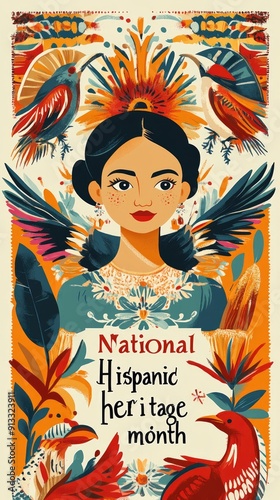 illustration National Hispanic Heritage Month, which depicts woman's face adorned with traditional patterns, surrounded by colorful plants and cultural motifs. Cultural pride and diversity.