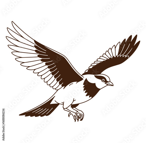 Illustration of a bird in mid flight with brown wings and clean lines on a white background
