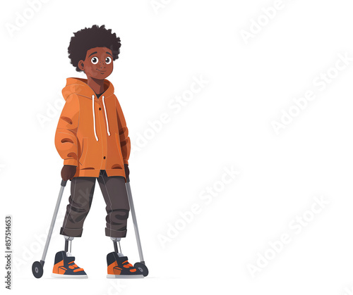 Illustration of a boy with walking disability, he has prosthetic legs, bionic leg, kids disability concept. Boy with crutches, flat cartoon illustration. Copy space