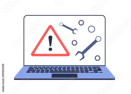 Illustration of a broken laptop. Error warning sign on the screen. Vector image of a broken or repaired computer