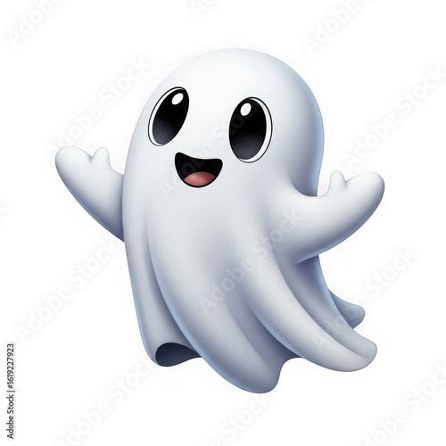 Illustration of a charming white ghost character with a friendly smile floats playfully on a transparent background