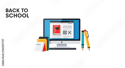 Illustration of a computer with a book and graduation cap on the screen with school supplies around it