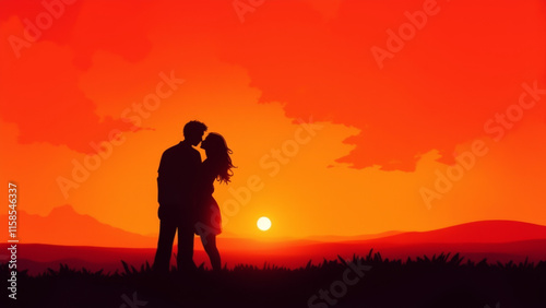 Illustration of a couple silhouette at sunset, symbolizing love and romance.
