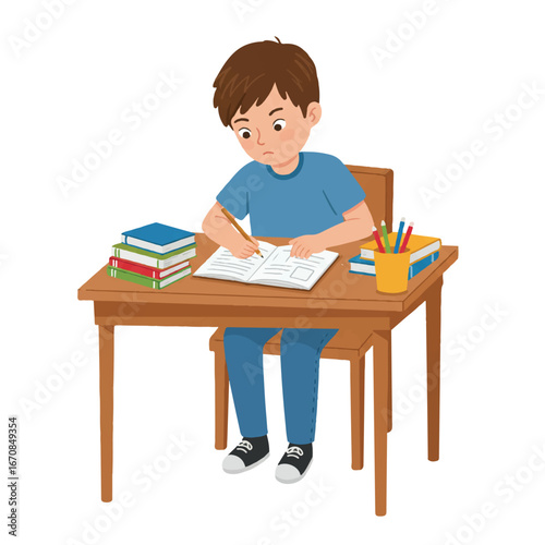 illustration, focused, young, boy, sitting, desk, writing, notebook, book, around, him, plain, white, background, learning, children, clip, student, school, human, teenage, education, stationery, graphic, furniture, person, indoor, chair, children, cartoon, art, digital, vector, colourful, backpack, table