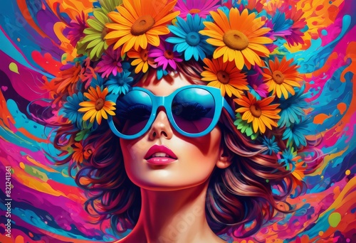 sunglasses, colored background, illustration, flower, female, woman, model, lady, portrait, fashion, trendy, stylish, modern, vibrant, art, digital artwork, creative, artistic, unique, design, graphic, head shot, missy, eyewear, casual attire, cool, hipster, face, abstract, drawing, coiffure, summer, chic, beauty, attractive, expressive, fun, bold, conceptual, fashionable, colourful, hair, goggles, person, style, retro, glamour, people
