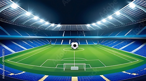 illustration of a grand football stadium at night. The stadium should have a large, well-maintained grass field with a soccer ball placed at the center