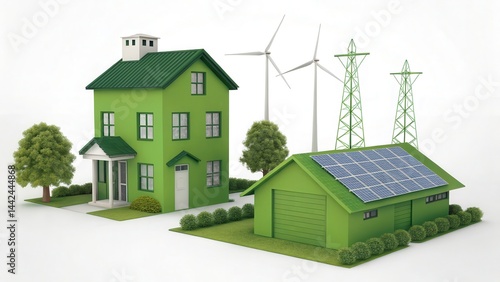 Illustration of a green sustainable home using solar panels, wind turbines, and power grid connections for clean energy living.