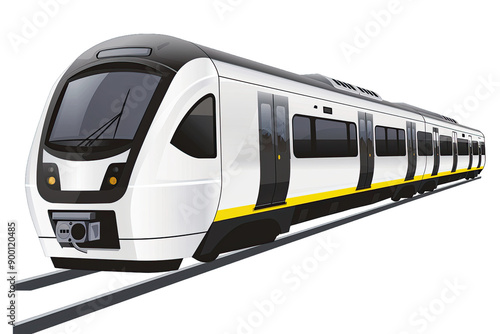 Illustration of a modern electric train on rails, featuring sleek white design and yellow accents, symbolizing efficient transportation.