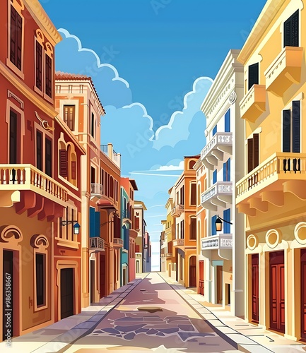 street, building, narrow, colourful, architecture, city, illustration, town, design, art, house, window, balcony, door, sky, cloud, sun, bright, vibrant, urban, perspective, landscape, drawing, graphic, digital, painting, image