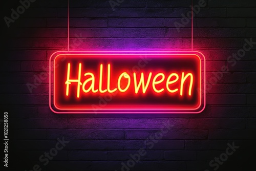 Illustration of a neon sign with the text "Halloween" on a black wall background for decoration and covering. Artwork design element for a holiday constructor