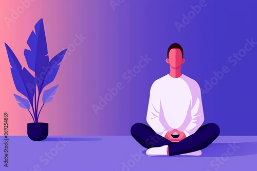 Illustration of a person meditating in a serene, colorful space with a potted plant, evoking calmness and mindfulness.