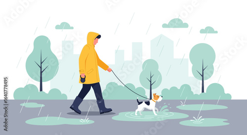 rain, dog, walk, raincoat, puddle, pet, wet, weather, cartoon, happy, canino, leash, person, urban, lifestyle, animal, nature, design, city landscape, cloud, tree, street, recreation, cheerful, illustration, vector, background, season, rainy, splash, scene, climate, clothing, activity, character, friends, spring, style, modern, playful