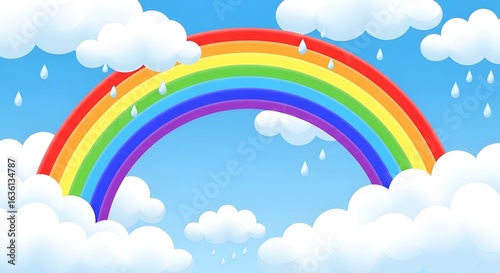 Illustration of a rainbow with clouds and raindrops against a blue sky backdrop