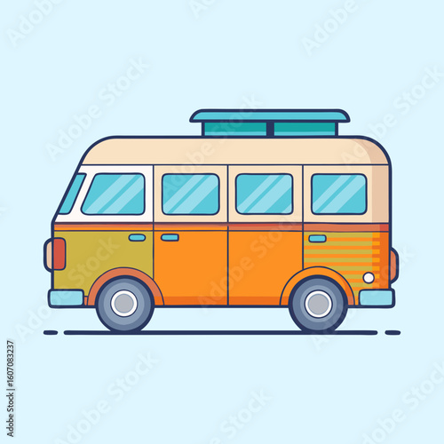 camper, van, retro, vehicle, transportation, illustration, travel, adventure, vintage, classic, touring, transport, design, icon, art, graphic, simple, flat, style, colourful, orange, beige, green, blue, wheel, window, vector, drawing, clip art, cartoon, tour tourism, vacation, holiday, escape, wanderlust