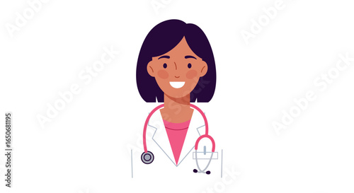 Illustration of a smiling female doctor wearing a white coat and stethoscope, ready to help patients.