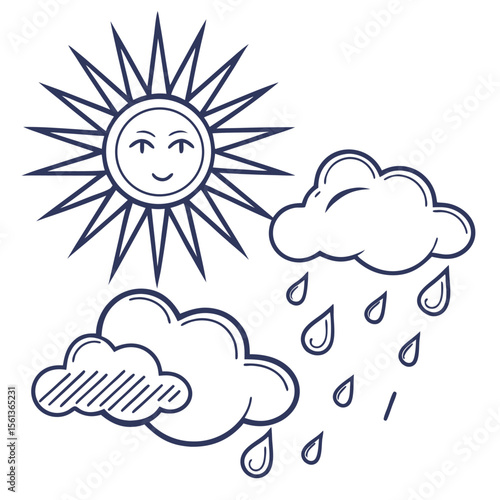Illustration of a smiling sun with rays and two clouds one with rain and one with lines inside it