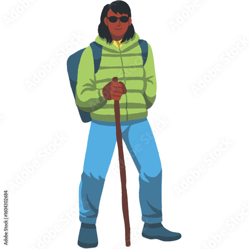 Illustration of a solo hiker with a backpack and walking stick, representing outdoor adventure and an active lifestyle.