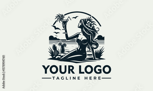 Illustration of a woman on a beach holding a drink, with palm trees, waves, and a bird in the background.