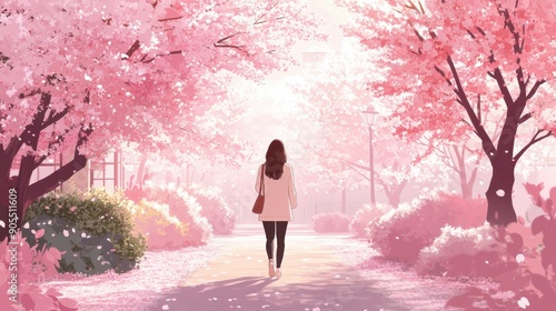 Illustration of a woman walking in a cherry blossom garden, viewed from the back, creating a serene and picturesque scene.