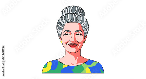 Illustration of an older woman with gray hair styled in a bun, wearing a colorful top smiling