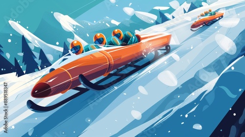 Illustration of Bobsled team racing down an icy track, speed and coordination, winter sport