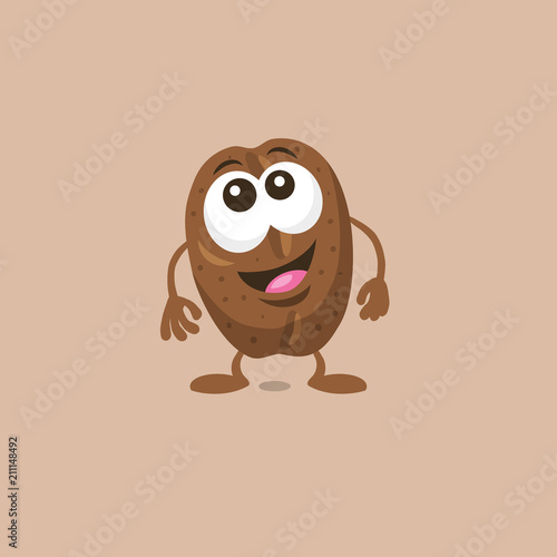 Illustration of cute surprised coffee bean mascot with big smile isolated on light background. Flat design style for your mascot branding.