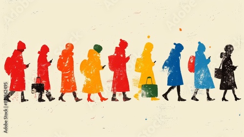 illustration, businessperson, tied-up, hurry, stylised, walking, multitask, urban, silhouette, dynamic, movement, professional, lifestyle, active, technology, communication, rush hour, city life, corporate, abstract, colourful, crowd, cartoon, commuter, contemporary, workday, in motion, productivity, connectivity, artistic, trendy, upbeat
