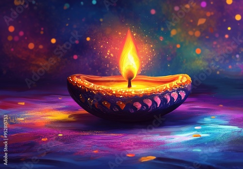 Illustration of Diwali, a colorful background with oil lamps and flowers in shades of purple