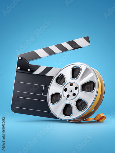 Illustration of film entertainment, with a clapboard and film reel as the main focus, blue background