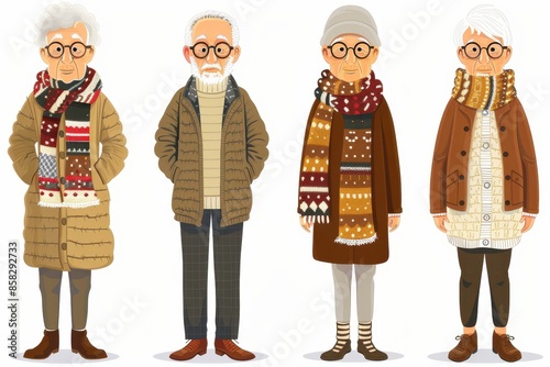 illustration, 4, senior, winter, clothing, racked, together, dress, warmly, coat, friendly, people, pose, outfit, autumn, hat, fashion, wear, boot, smile, friends, season, bond, fleece, knit up