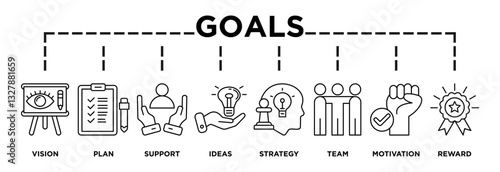 Illustration of goals displaying its key steps: vision, plan, support, ideas, strategy, team, motivation, reward content icons and text