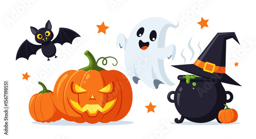 Illustration of halloween elements including pumpkins bat ghost witch hat and cauldron with stars