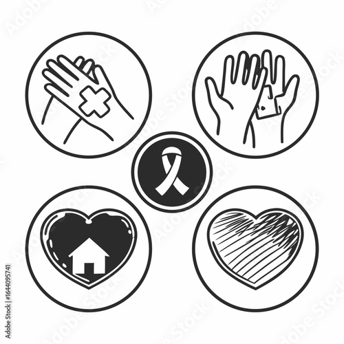 Illustration of health and safety icons including washing hands, bandage, heart, and ribbon isolated on white background