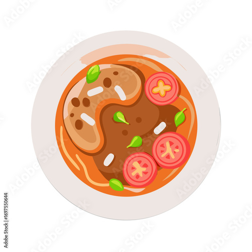soup, tomatoes, basil, broth, bowl, dish, food, plate, meal, illustration, graphic, vegetable, healthy, lunch, dinner, vector, art, clip art, cooking, cookery, ingredient, topview, nobody, rice, tomatoes, leaf, orange, white, minimalist, simple, cartoon, culinary, garnish, fresh, kitchen, organic, eatery, vegan, vegetarian, diet