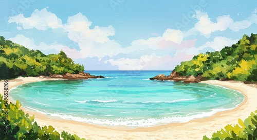 Illustration of Idyllic Tropical Beach Cove with White Sand and Turquoise Water